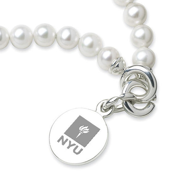 New York University pearl bracelet and sterling silver NYU charm features the NYU logo delicately engraved on front and interlocking "C" clasp.