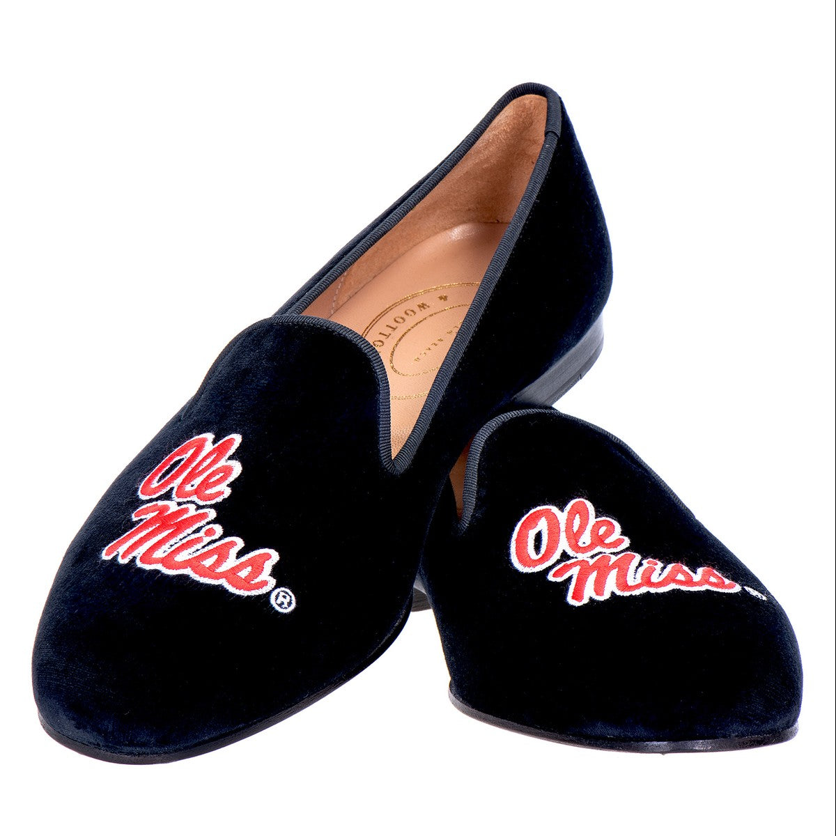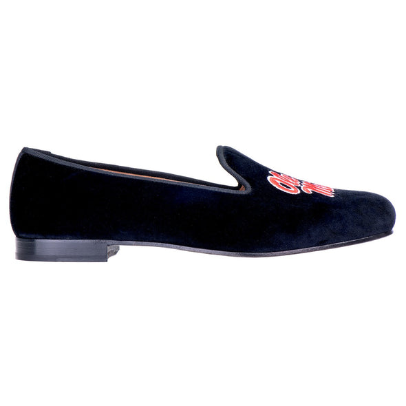Hand-crafted in Spain by fashion icon Stubbs & Wootton, the University of Mississippi Women's slipper features a Spanish Cotton-Velvet Upper with a Grosgrain Trim. Finished off with a detailed embroidery of the Ole Miss Logo on each toe, these slippers are the perfect addition to any ensemble.