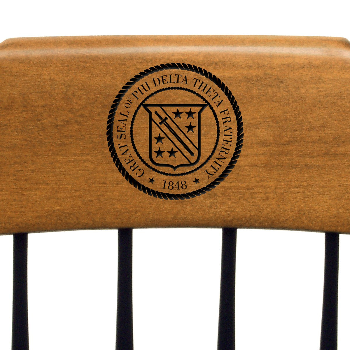 The body of the Phi Delta Theta Captain's Chair is painted a handsome satin black with hand-painted gold beading and features a cherry finish on the top crown of the chair.