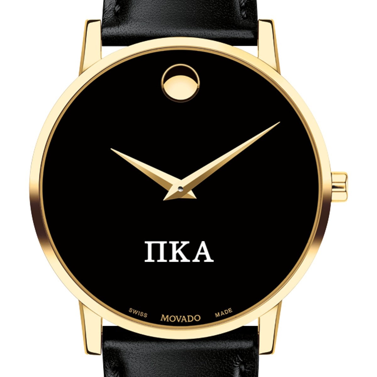Pi Kappa Alpha Men's Movado Museum watch features the Pi Kappa Alpha Logo in full color at 6 o'clock on black dial. Created in 1947, the iconic concave dot symbolizes the sun at high-noon. Complimentary personal engraving.