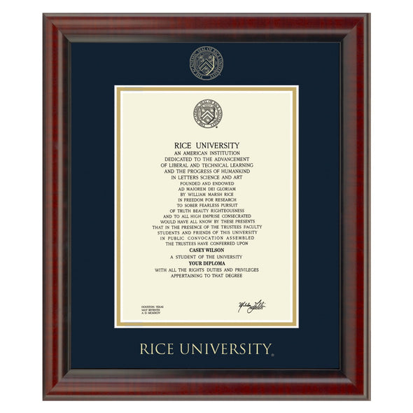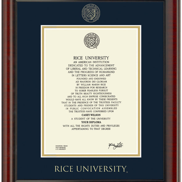 This Rice University diploma frame is crafted from solid wood in the USA. Proudly display your Rice diploma with museum quality conservation mounting materials to showcase and protect your Rice University diploma.