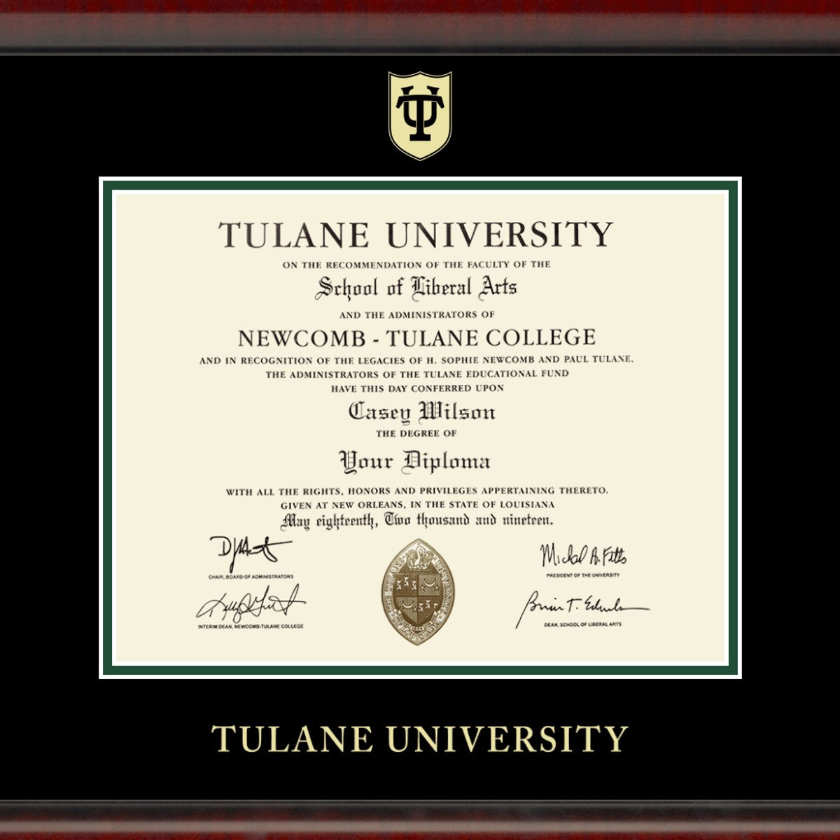 This Tulane University diploma frame is crafted from solid wood in the USA. Proudly display your Tulane diploma with museum quality conservation mounting materials to showcase and protect your Tulane University diploma.