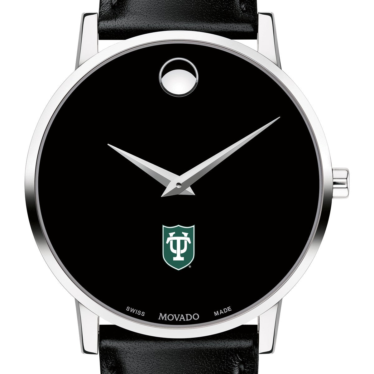 Tulane University Men's Movado Museum watch features the Tulane Logo in full color at 6 o'clock on black dial. Created in 1947, the iconic concave dot symbolizes the sun at high-noon. Complimentary personal engraving.