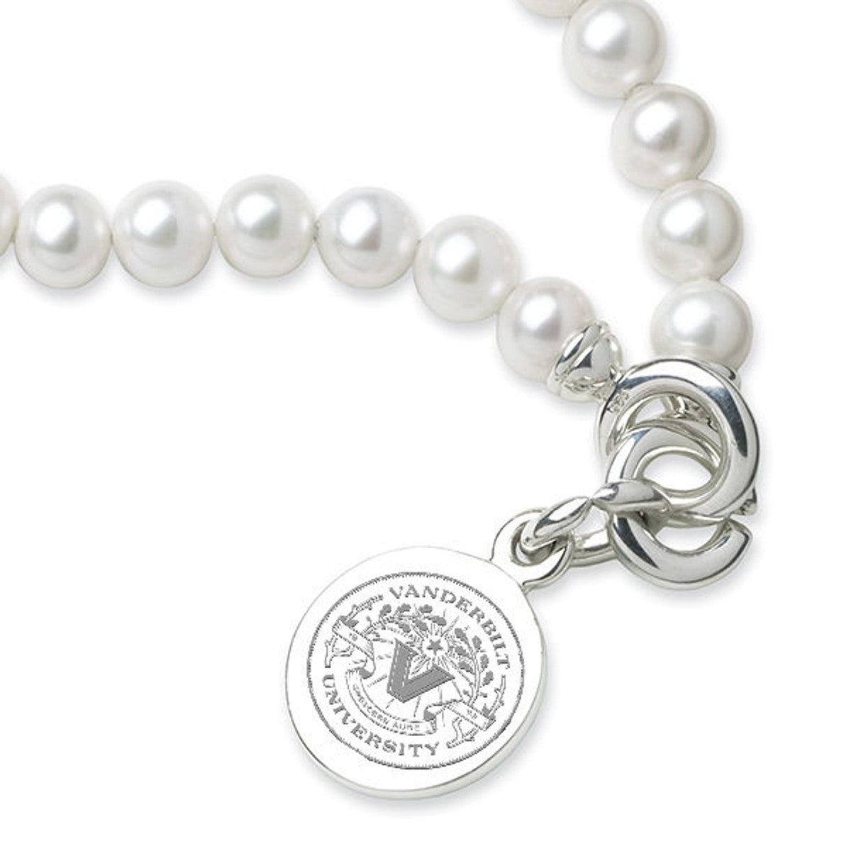 Vanderbilt University pearl bracelet and sterling silver Vanderbilt charm features Vanderbilt seal delicately engraved on front and interlocking "C" clasp.