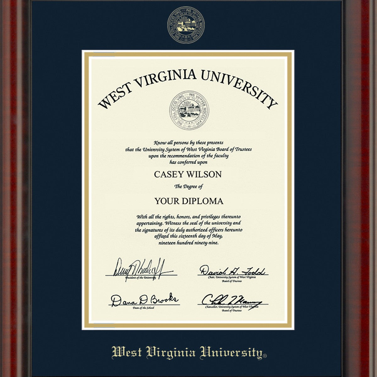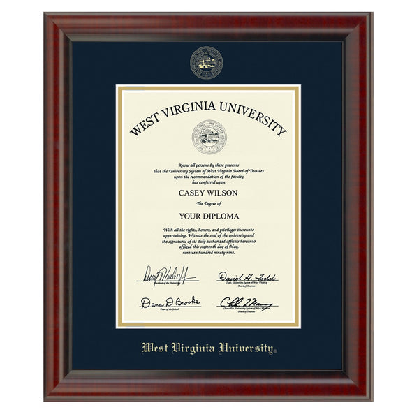 This West Virginia University diploma frame is crafted from solid wood in the USA. Proudly display your West Virginia diploma with museum quality conservation mounting materials to showcase and protect your West Virginia University diploma.