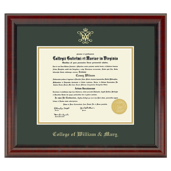 This College of William & Mary diploma frame is crafted from solid wood in the USA. Proudly display your William & Mary diploma with museum quality conservation mounting materials to showcase and protect your College of William & Mary diploma.